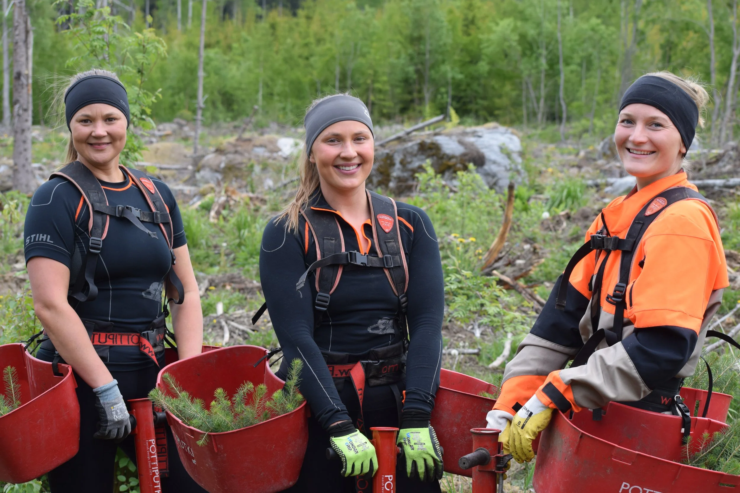 Metsuritrio tekee monipuolisesti metsänhoitotöitä: raivaa, istuttaa, kaataa puita ja hoitaa taimikoita. Kaikkea tehdään, mutta isojen puiden kaato moottorisahalla on ainakin Ellan mielestä vaativuudessaan hienointa.